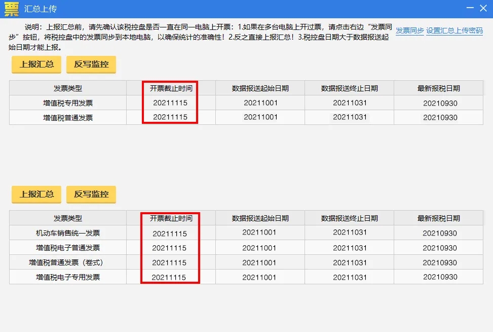 操作流程:重新打開匯總上傳界面,查看各發票類型開票截止時間是否更新到下月中旬,若更新,說明操作成功。