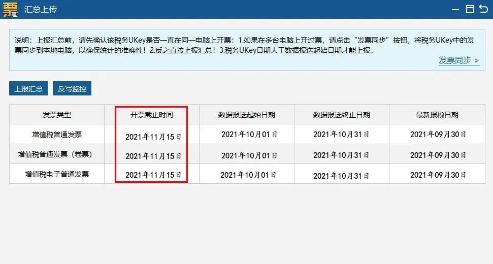 開票電腦聯網穩定且軟件中服務器地址和端口號正確的情況下,登錄開票軟件會自動上報匯總,申報完成后,再次打開開票軟件,會自動反寫。需核對開票截止日期是否更新到2021年11月15日左右。